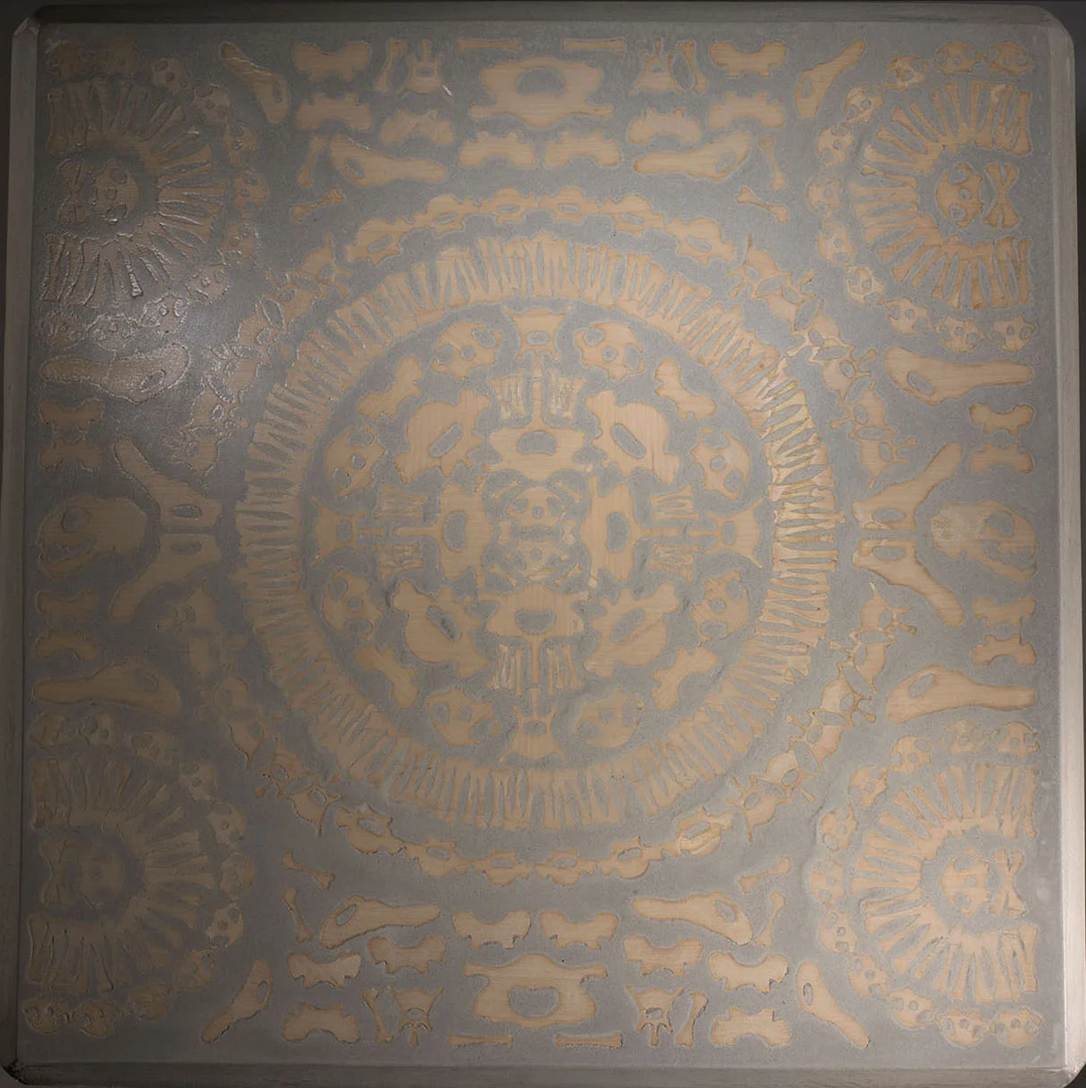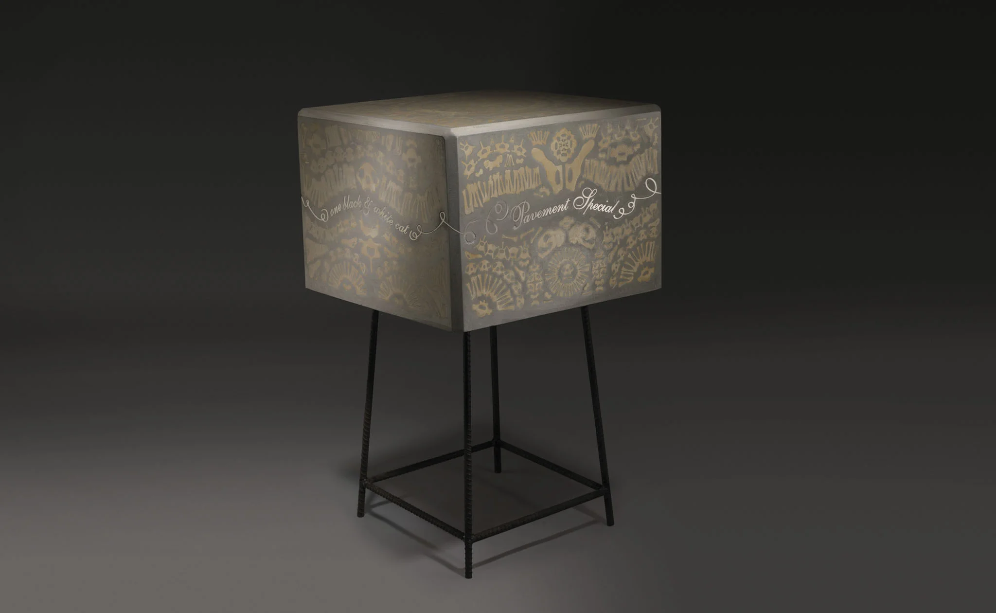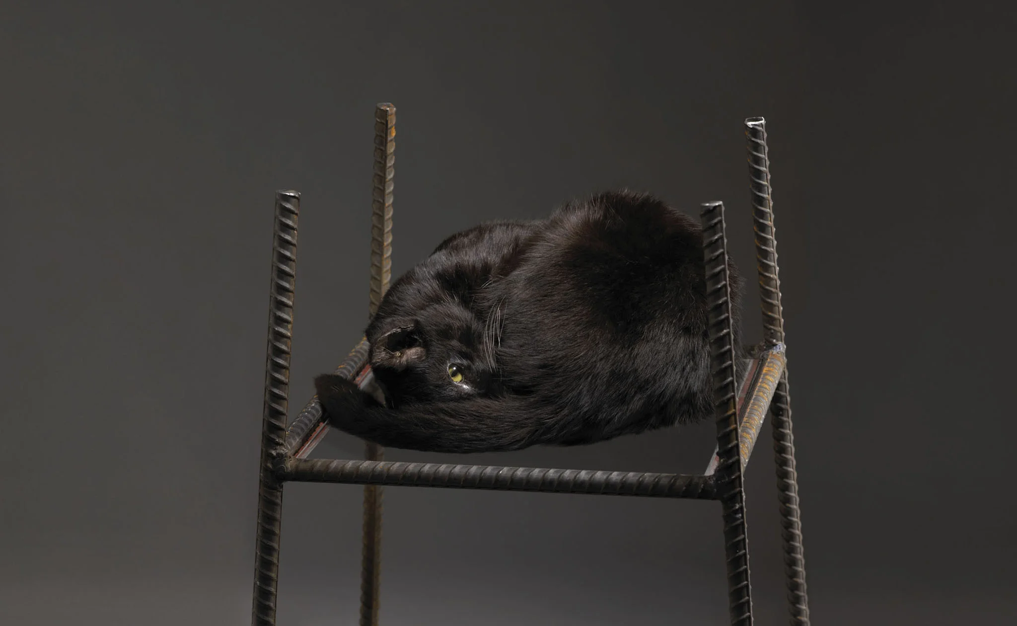 Concrete; Maple wood; steel; Rebar steel stand; glass; an interred black and white cat.